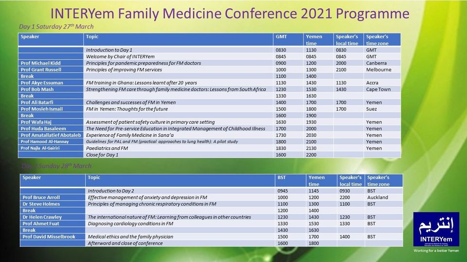 The INTERYem Community and Family Medicine Conference has several objectives. Foremost is the desire to provide an update for FM practitioners, or an overview for those new to the field. Furthermore, the conference will provide an opportunity to exchange information by practitioners and academics in FM from several countries, and this interplay will allow seeds of collaboration to exist. Finally, the FM conference will allow for the initiation of considering where the gaps in training in FM maybe amongst Yemen’s FM HCPs and help us to consider how to work with Yemeni colleagues to fill those gaps.